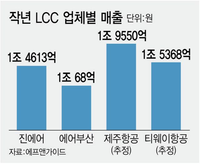 실적 발표가 남아 있는 다른 LCC도 1조원 넘는 매출을 기록했을 전망이다. 시장조사업체 에프앤가이드에 따르면 제주항공(089590)의 매출 컨센서스는 1조 9550억원, 티웨이항공(091810)은 1조 5368억원으로 예상된다.