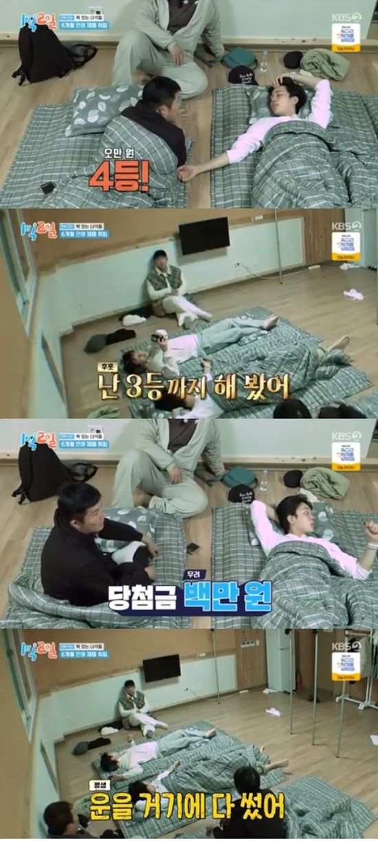 그때 야외취침 멤버들이 자기 전에 실내로 잠깐 들어왔다. 멤버들은 앞서 복권 긁기로 실내취침자를 결정했던 터라 각자 복권 당첨 경험에 대한 얘기를 나눴다.