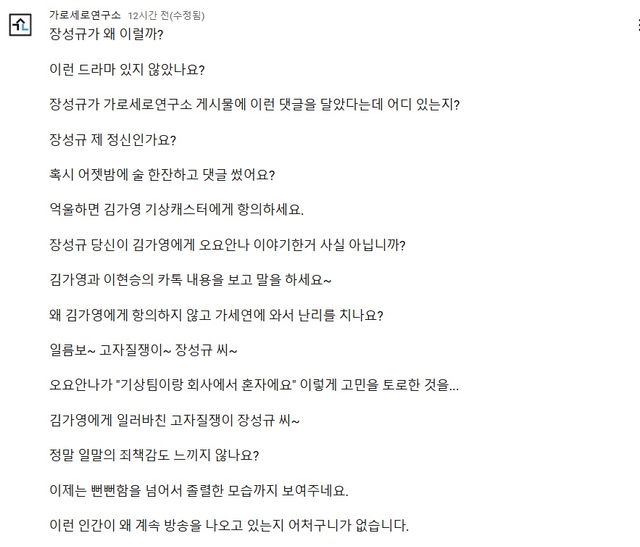 9일 MBC 기자 출신 가로세로연구소(가세연) 대표 김세의는 유튜브 가로세로연구소 채널 커뮤니티에 "장성규가 왜 이럴까? 이런 드라마 있지 않았나요? 장성규가 가로세로연구소 게시물에 이런 댓글을 달았다는데 어디 있는지? 장성규 제 정신인가요? 혹시 어젯밤에 술 한잔하고 댓글 썼어요?"라는 글을 올렸다.