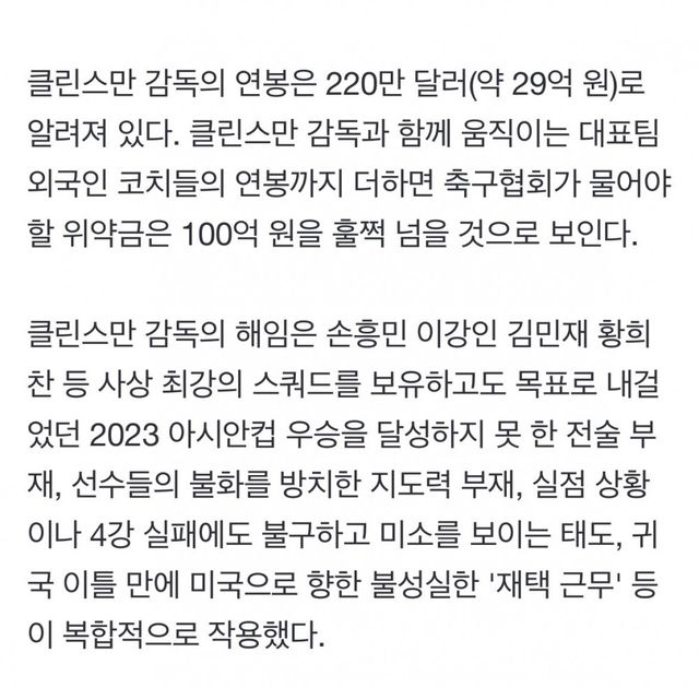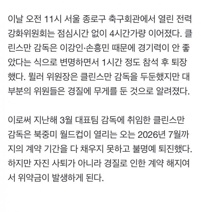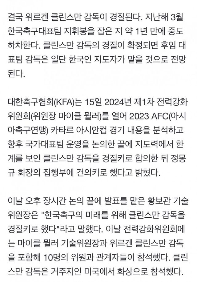 클린스만 감독 경질 건의, KFA 전력강화위 발표…후임은?