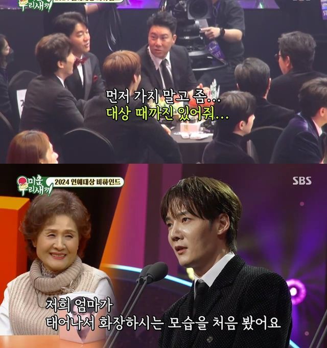 연예대상 당일, “상 복이 없는 것 같다”라며 일찍 가자고 농담을 던지는 탁재훈에게 이상민은 “미안하지만 대상까지는 좀 기다려줘”라며 대상 욕심을 드러냈다. ‘SBS의 아들 상’을 받게 된 이상민은 수상소감에 “느낌이… 올해도 (대상이) 아닌가 보다”라면서 대상에 대한 미련을 여전히 드러냈다. 한편 우수상을 수상한 최진혁은 “(미우새에 출연하며) 엄마가 화장하시는 모습을 처음 봤다. ‘미우새’ 제작진에 감사드린다”라고 소감을 전했다.
