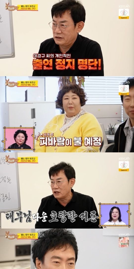 [메디먼트뉴스 김수현 기자] 방송인 이경규가 예능 프로그램 출연 금지 대상자를 공개하며 화제를 모으고 있다. 지난 9일 방송된 KBS 2TV '사장님 귀는 당나귀 귀'에서는 이경규가 예능계의 현실을 직설적으로 분석하고, 자신만의 '예능 블랙리스트'를 공개하는 모습이 전파를 탔다.
