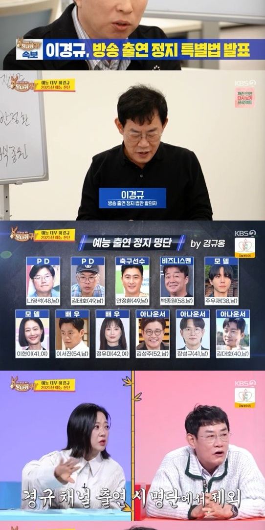 이경규는 마지막으로 자신이 정한 '출연 정지 명단'을 공개했다. 이 명단에는 나영석, 김태호, 안정환, 백종원, 주우재, 이현이, 이서진, 정유미, 김성주, 장성규, 김대호 등이 이름을 올렸다. 이경규는 "이 명단에 오른 인물들이 방송 출연을 하면 가택 연금에 들어갈 것"이라며 단호한 입장을 보였다. 다만 자신의 유튜브 채널에 출연할 경우에는 명단에서 제외될 수 있다고 덧붙였다.