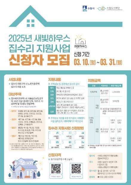 새빛하우스 사업 신청을 원하는 주택 소유자는 수원시 집수리통합플랫폼에서 신청 자격을 확인한 후 수원시에 등록된 집수리 지원업체(92개소)와 함께 신청 서류를 수원도시재단주거복지센터(권선구 수인로 더함파크 2층)에 방문해 제출해야 한다.