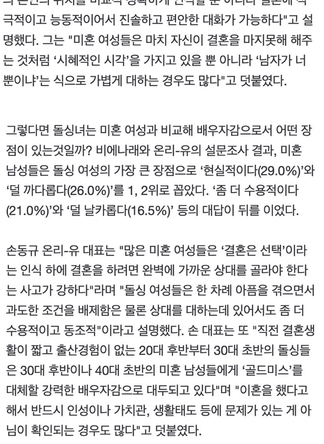30대 중반 넘어가면 만날수 있는 미혼 여성들이 까다롭게 굴어서 차라리 돌싱 만나는게 좋다는 사람도 많다고
