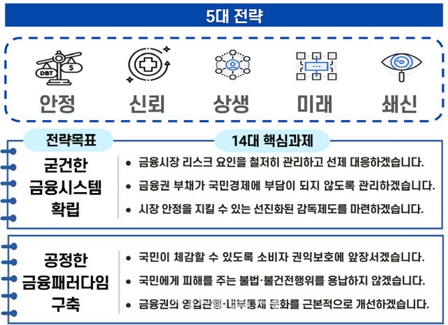 금융감독원은 이 같은 내용의 올해 업무계획을 10일 발표했다. 금감원은 올해 계획에 굳건한 금융시스템(안정), 공정한 금융패러다임(신뢰), 국민과 동반성(상생), 혁신기반 조성(미래), 내적쇄신 지속(쇄신)이라는 5대 전략목표를 세웠다,