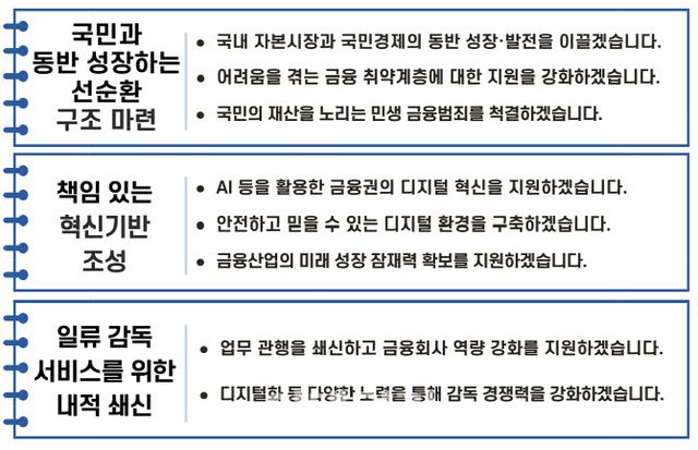 마지막 목표인 쇄신에는 금융감독원 내부적으로도 검사·제재, 약관심사, 분쟁처리 등 업무 프로세스를 혁신하고 감독업무의 디지털화 추진 등의 내용을 담았다. 구체적으로 감독서비스의 질적 제고를 위해 데이터 중심 감독체계 구축, 업무 프로세스 디지털화, 감독정보 접근성 확대 등 디지털 전환 로드맵을 단계적으로 이행 등이 포함됐다.