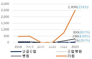 독감 검사와 치료주사 비급여 진료비 증가는 주로 의원급에서 나타났다. 2023년도 의원 비급여 독감 검사와 치료주사 진료비는 각각 2064억원과 2498억원으로, 전체 비급여 독감 검사의 87.8%, 비급여 치료주사의 80.5%를 차지했다. 증가율 역시 의원 비급여 독감 검사는 116%, 치료주사는 231%로, 전체 증가율(검사 113%↑, 치료주사 213%↑)을 웃돌았다.