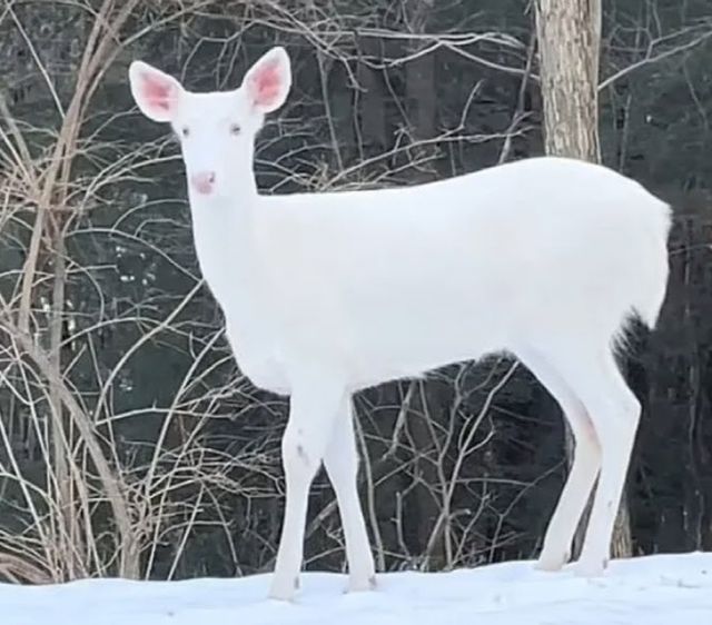25초 분량의 영상에는 눈 쌓인 도로에 선 알비노 사슴의 모습이 담겼다. 사슴의 털은 눈처럼 새하얗고, 귀 안쪽과 눈, 코는 옅은 분홍빛을 띠었다.