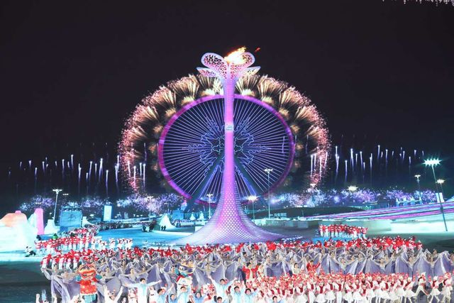 지난 7일(현지 시각) 중국 헤이룽장성 하얼빈 국제 컨벤션 전시 스포츠센터에서 열린 제9회 하얼빈 동계아시안게임 개막식에서 성화 점화 영상이 나오고 있다. / 뉴스1