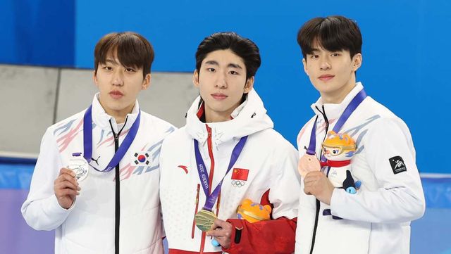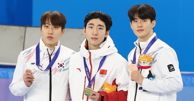 지난 8일(현지 시각) 중국 헤이룽장성 하얼빈 빙상훈련센터 다목적홀에서 열린 하얼빈 동계아시안게임 쇼트트랙 남자 500m 시상식에서 은·동메달을 획득한 박지원·장성우가 포즈를 취하고 있다. 사진 가운데는 금메달을 획득한 중국 대표팀 린샤오쥔(한국명 임효준). / 뉴스1