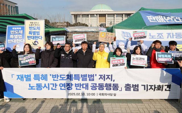 전국민주노동조합총연맹 전국금속노동조합, 한국노동조합총연맹 전국금속노동조합연맹, 노동당, 녹색당, 정의당, ‘반도체 노동자의 건강과 인권지킴이’(반올림)와 김용균재단 등 72개 단체는 10일 국회 앞에서 ‘재벌 특혜 반도체특별법 저지·노동시간 연장 반대 공동행동’(이하 공동행동) 출범식을 진행했다.