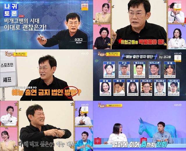 “’양심 냉장고’ 김영희 PD, ‘무한도전’ 김태호 PD도 괜찮지만 문제는 나영석”이라며 열을 올리기 시작한 이경규는 급기야 “백상 트로피를 반납하라”며 '방송출연금지 특별법'을 제안했고, “스포츠인 안정환이 나처럼 내 돈으로 프로그램 제작하는 게 아니지 않냐”며 흥분하다가 사위 김영찬 선수를 떠올리고는 입장을 번복했다.