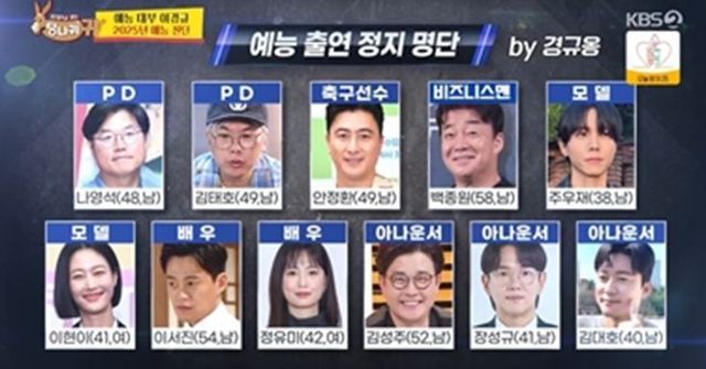 배우들 역시 블랙리스트로 분류한 이경규는 최종적으로 나영석, 김태호, 안정환, 백종원, 주우재, 이현이, 이서진, 정유미, 김성주, 장성규, 김대호 총 11명의 예능 출연 정지 대상을 선정하며 “단, 내 유튜브에 출연하면 출연 정지 리스트에서 빼준다”고 말해 폭소를 안겼다.