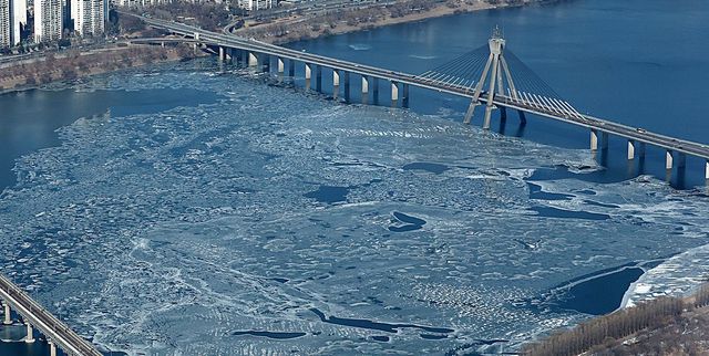 찬 대륙고기압의 영향으로 추위가 지속되고 있는 지난 9일 서울 송파구 롯데월드타워 서울스카이에서 바라본 올림픽대교 인근 한강이 얼어붙어 있다. 기상청은 이날 이번 겨울들어 처음으로 한강이 결빙되었다고 발표했다. 이번 한강 결빙은 평년(1월 10일)보다 30일, 지난 겨울(2024년 1월 26일)보다 14일 늦게 나타났으며 1964년 2월 13일에 이어 관측 이래 두 번째로 늦은 결빙이다. 자료 사진 / 뉴스1
