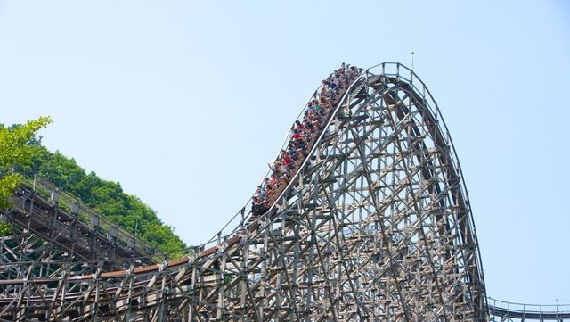 '티익스프레스'는 최고 시속 104㎞, 56m 높이에서 77도 각도로 낙하하며 12번의 무중력 상태를 경험할 수 있는 롤러코스터다. 지난해 나무와 스틸 트랙을 결합한 하이브리드 구조로 개선했다.