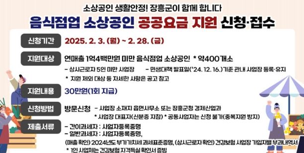 지원 대상 소상공인은 2024년 12월 16일 기준 장흥군에 사업장을 두고 운영 중인 음식점업이다.