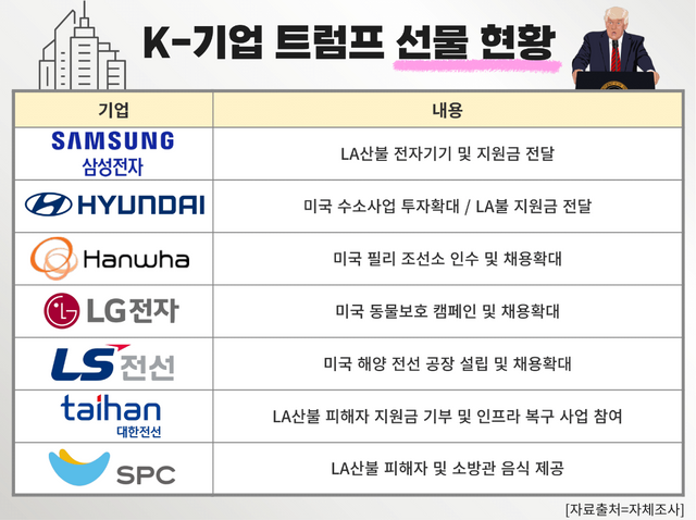 외교 공백이 우려되는 상황 속에서 국내 기업들은 각자도생에 나섰다. 트럼프를 상대할 국내 정상이 부재한 만큼 직접 외교 전선에 뛰어든 것이다. 국내 기업들은 채용 확장, 투자 확대, ESG 활동 강화 등 각자의 방식으로 트럼프의 호의를 사기 위해 노력하고 있다. 먼저 삼성전자 대규모 산불로 초토화된 미국 캘리포니아주 로스앤젤레스(LA)에 100만달러(약 14억5000만원)어치 전자 제품을 기부하기로 결정했다. 또 저소득층을 우선으로 지역사회 재건에 앞장설 것이라 밝혔다.
