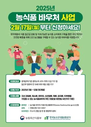 지원 신청은 2월 17일부터 주민등록 주소지 동 행정복지센터를 방문하거나 농식품 바우처 누리집 온라인 홈페이지, ARS 전화 등을 통해 접수하면 된다. 다만 외국인 및 가구주 외 대리신청, 변경신청, 임산부 여부 추가 확인 등이 필요한 경우에는 증빙서류를 지참해 방문 신청해야 한다.
