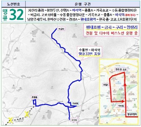 [와이뉴스] 남양주시는 수동면 비금리~서울 청량리 구간을 운행 중인 330-1번 버스를 내달 1일부터 땡큐 32번(차산리~비금리~호평동)으로 전환한다고 10일 밝혔다.