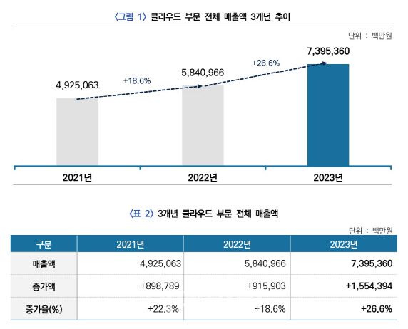최근 과학기술정보통신부와 정보통신산업진흥원(NIPA)이 발표한 ‘2024년 클라우드 산업 실태조사’ 결과보고서를 보면, 2023년 국내 클라우드 업계의 매출은 7조3900억원으로 전년(2022년)보다 약 26.6% 늘었다. 2022년 전년(2021년) 대비 매출액 증가율인 18.6%보다 약 8%포인트 증가한 수준이다.