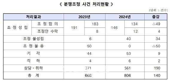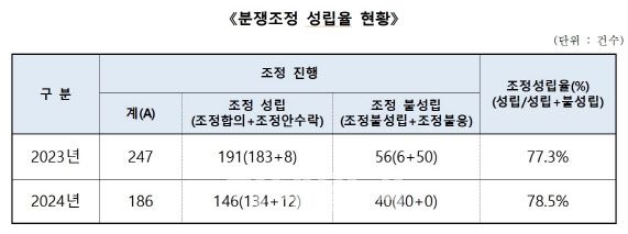 또한 지난해 조정성립율은 78.5%로 전년(2023년) 대비 1.2%포인트 상승햇다. 손해배상금(합의금 포함) 지급 건은 일부 감소했지만, 평균 지급액은 57만원으로 전년도 평균 지급액(28만원) 대비 큰 폭으로 증가했다.