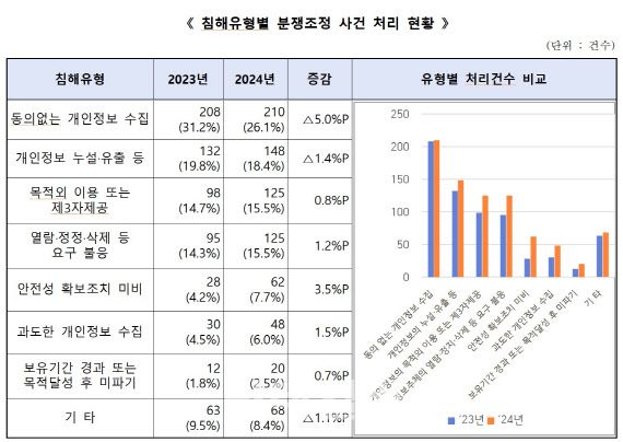 분쟁조정 침해유형별로 살펴보면 △‘동의없는 개인정보 수집’ 210건(26.1%) △‘개인정보 누설·유출’ 148건(18.4%) △‘개인정보의 목적 외 이용·제3자 제공’ 125건 (15.5%) △정보주체의 열람·정정·삭제 등 요구 불응’ 125건(15.5%) 순으로 많았다.