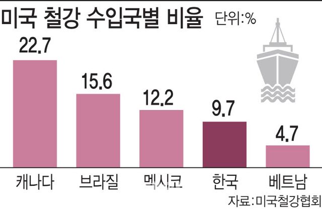 앞서 트럼프 대통령은 2018년 첫 임기 때 ‘자국 철강산업 보호’를 이유로 무역확장법 232조를 적용해 철강 제품에 25% 관세를, 알루미늄 제품에 10% 관세를 부과한 바 있다. 이에 한국은 협상 끝에 관세를 면제받는 대신 수출 물량을 제한하는 쿼터제를 도입해 연간 ‘263만톤(t) 무관세’를 적용받고 있다.