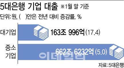 같은 기간 대기업 대출은 138조 9484억원에서 163조 996억원으로 24조 1512억원(17.4%) 늘어난 반면 중소기업 대출은 631조 1966억원에서 662조 6232억원으로 31조 4266억원(5%) 증가했다. 지난해 말과 비교하면 한 달 동안 대기업 대출은 한 달 동안 4조 7061억원 급증했지만 중소기업 대출은 3942억원 느는데 그쳤다. 1년 전에 비하면 가계대출은 38조 3445억원, 기업대출은 55조 5778억원 증가했다.