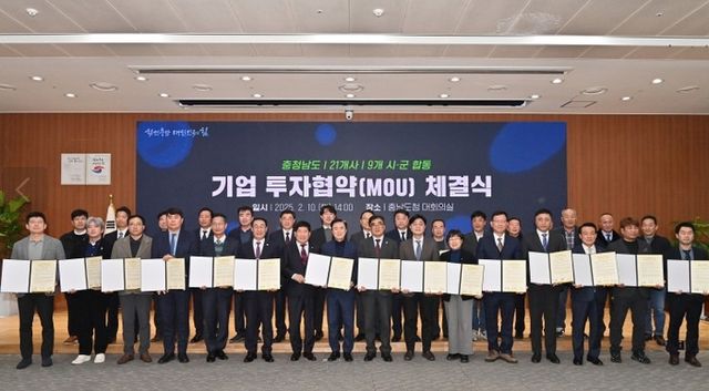 김태흠 지사는 10일 도청 대회의실에서 박상돈 천안시장 등 9개 시군 단체장·부단체장, 김종학 태성 대표이사 등 21개 기업 대표와 투자협약을 체결했다.