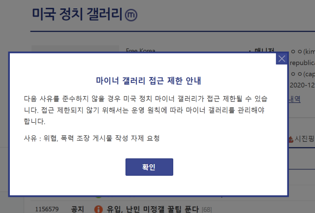 한편 디시인사이드는 10일 '마이너 갤러리 접근 제한 안내' 공지를 띄우고 "다음 사유(위협, 폭력 조장 게시물 작성 자제 요청)를 준수하지 않을 경우 미국 정치 마이너 갤러리가 접근 제한될 수 있다"고 경고했다.