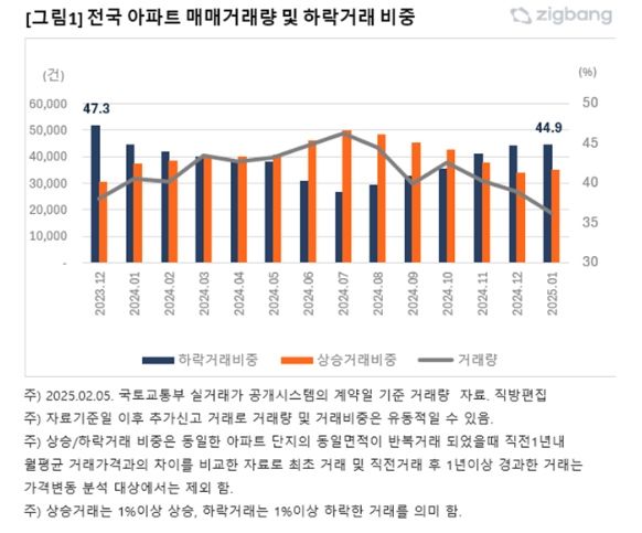 10일 부동산 정보 제공 업체인 직방이 국토교통부 아파트 실거래가를 분석한 결과를 살펴보면 2025년 1월 거래 중 전국 44.9%는 ‘하락 거래’로 조사됐다. ‘하락 거래’는 종전 거래가격과 비교해 1% 이상 낮은 가격에 거래된 것으로 ‘상승 거래’는 종전 거래가격보다 1% 이상 높은 가격에 거래된 것을 의미한다.
