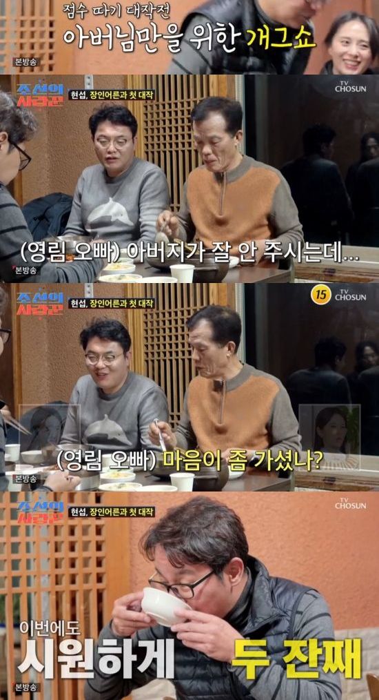 정영림 아버지는 자연스럽게 심현섭에게 음식을 덜어줬고, 정영림 오빠는 "아버지가 잘 안 주시는데 마음이 좀 가셨나"라며 귀띔했다. 더 나아가 정영림 아버지는 "내가 (술) 한 잔 줄까?"라며 물었고, 심현섭은 "감사하다"라며 감격했다.