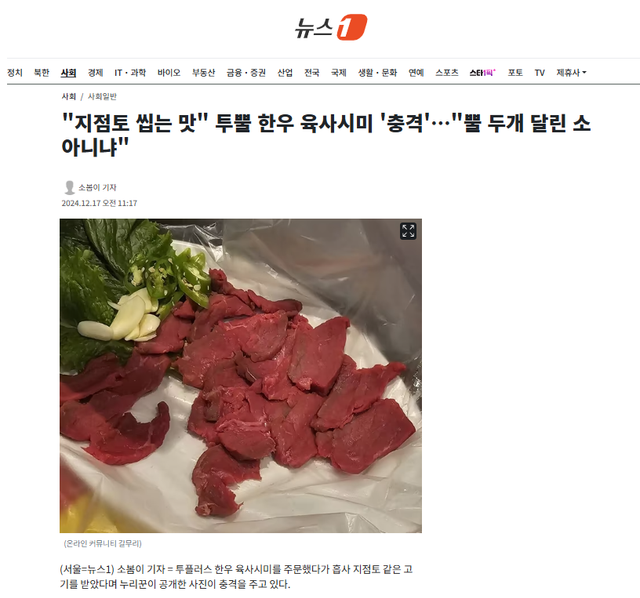 이에 따르면 그가 주문한 메뉴 '투뿔 한우사시미'는 1만 4000원짜리였다. 사진 속 사시미는 짙은 붉은 색을 띠고 있었으며 접시 위에 약 20점 정도가 고추, 마늘과 함께 올라가 있었다.