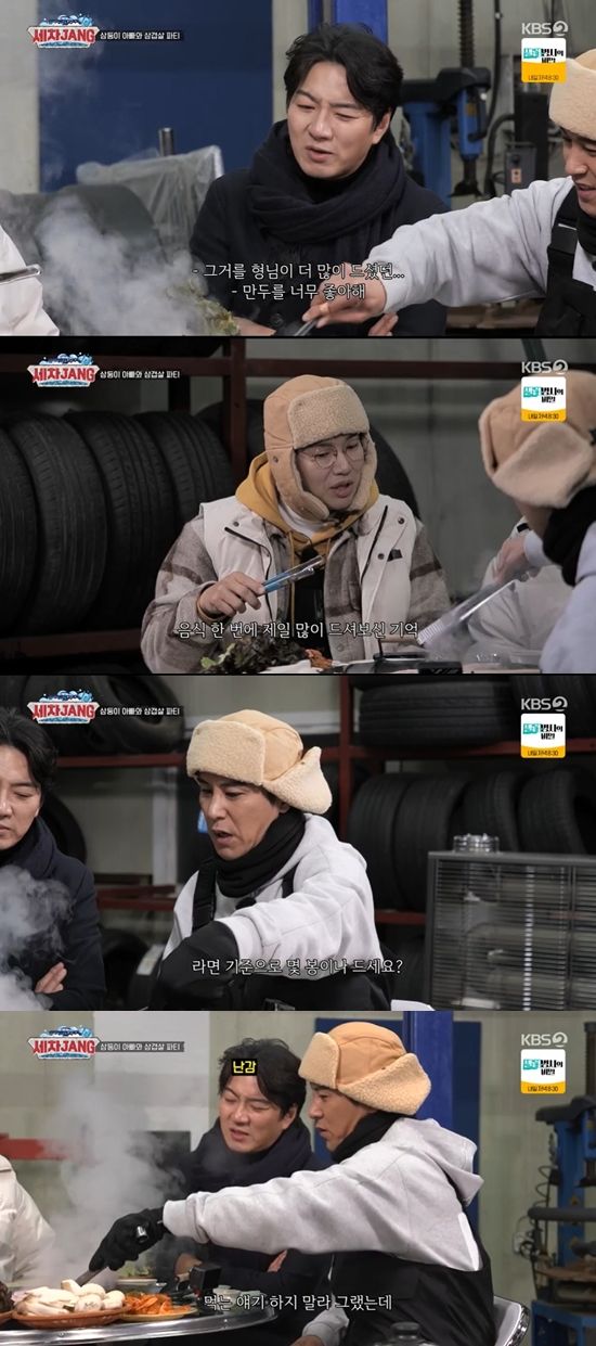 본격적으로 고기를 굽기 시작한 장성규는 "그러고보니 '슈돌'에서도 아이들보다 갈비만두를 형님이 더 많이 드셨던 게 기억난다"고 말했고, 송일국은 "만두를 좋아한다"고 말했다.