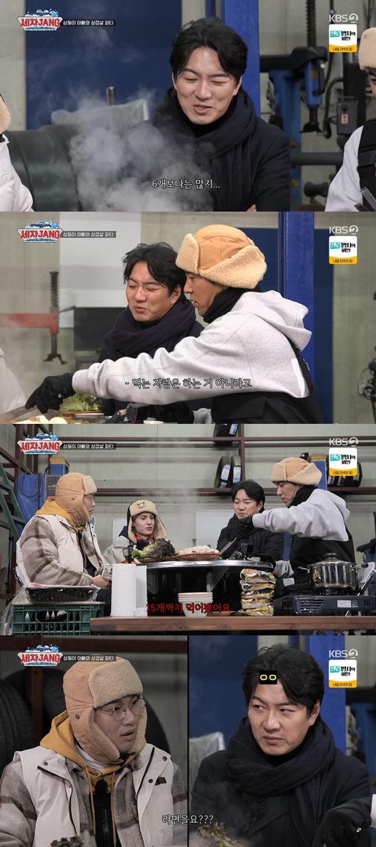 송일국은 "아이, 먹는 얘기 하지 말라고 그랬는데"라고 조심스러워했는데, 장성규는 "저는 6봉지까지 먹어봤다. 대신 국물은 다 못 먹었는데, 6개보다 많으시냐"고 물었다. 이에 송일국은 "6개보다는 많지"라면서 "여기까지"라고 선을 그었다.