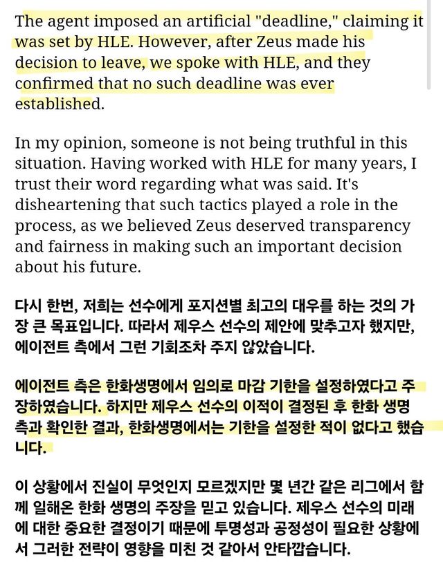 이번 인터뷰에서 한화생명은 마감기한이 있었다고 밝혔는데, 이전에 T1 CEO 조마쉬의 무물(아래사진)을 보면 T1에게는 마감기한 없었다고 했었음.