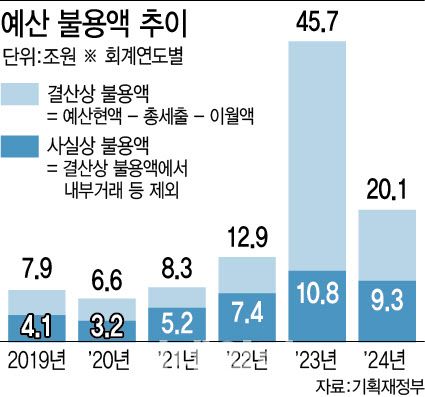 불용액은 20조 1000억원이다. 이는 국세수입 감소에 연동한 지방교부세 감액조정(6조 5000억원) 및 정부 내부거래(4조 3000억원) 등을 포함한 결산상 불용액으로 예산현액에서 총세출과 다음 연도 이월액을 뺀 금액이다. 정부는 다만 ‘사실상 불용’이라는 표현을 빌려 사업비에 쓸 돈을 못 쓴 것과 재난·재해 발생 감소로 예비비를 집행하지 않은 돈은 9조 3000억원이라고 설명했다.