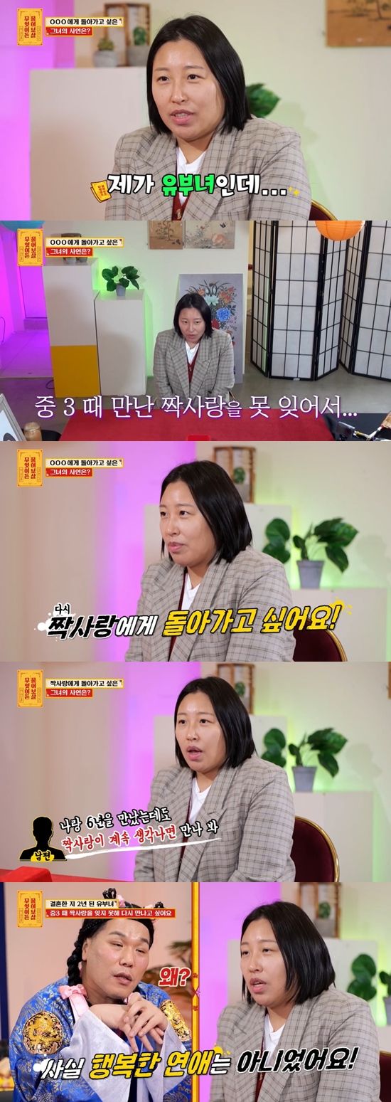사연자는 "44살 유부녀인데, 중3 때 만난 짝사랑을 못 잊어서 다시 짝사랑에게 돌아가고 싶어서 나왔다"고 언급했다. 결혼한지 2년이 되었다는 사연자는 이혼을 했냐는 말에는 "이혼은 안 했다. 남편의 허락을 받았다"고 답했다.