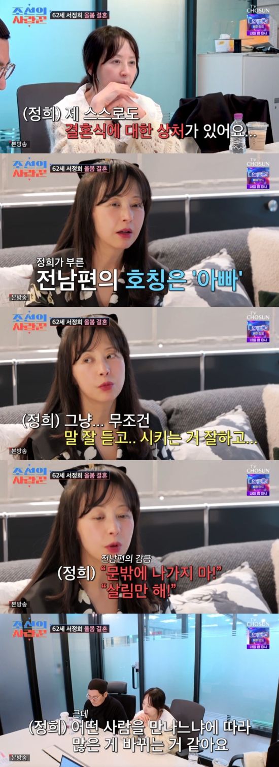 서정희는 "저도 아기였다. 워낙 작고 30 몇 kg밖에 안 나가는 아이였는데 갑자기 결혼생활이라는 걸 하게 되니까 너무 힘들었다. 사랑 이런 거 몰랐고 남편에 대한 사랑이 늘 일방적이고 무섭고 그러니까 '다시 태어나면 누구랑 결혼할 거야?' 이렇게 교육을 받는다. 다시 태어나도 저는 당신하고 결혼할 거예요. 아빠하고 결혼할게요. '너 이 옷 누가 사줬어?' 하면 '아빠가요' 했다. 남편이 당신도 여보도 아니고 아빠라고 항상 불렀다. '말 잘 들으면 사줘 안 사줘?' 이런 식이다. 그럼 '말 잘 들을게요' 그런 식이었다. 저는 항상 그렇게 말을 해야 했다. 좋든 싫든. 무조건 말 잘 듣고 시키는 거 잘하고 문밖에 나가지 말라면 안 나가고 살림만 하라고 하면 하고"라며 고백했다.