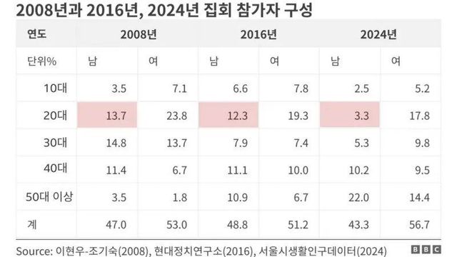 다만, 특이한 점은 2008이나 2016이나 20대 남성의 시위 참여율이 저조하다가 30대에 여성과 비슷해지는데,