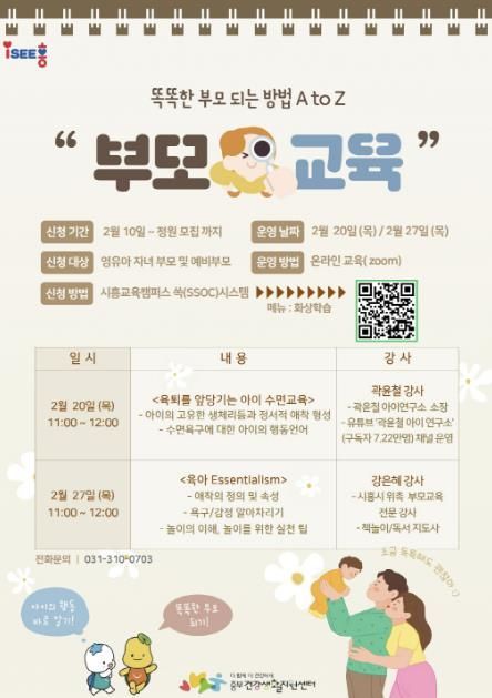 [와이뉴스] 시흥시 중부건강생활지원센터는 영유아 자녀를 둔 부모와 예비 부모를 대상으로 ‘똑똑한 부모 되는 방법 A to Z : 부모교육’ 강좌를 2월 20일과 27일 총 2회에 걸쳐 진행한다.