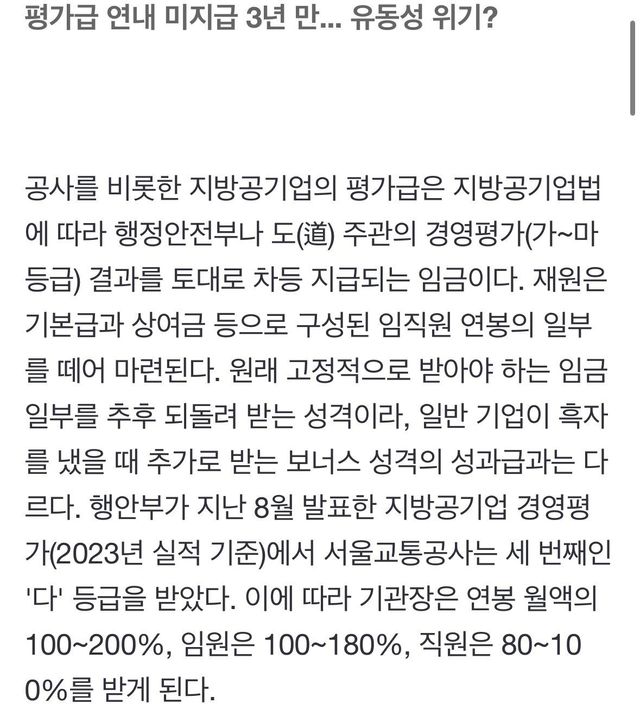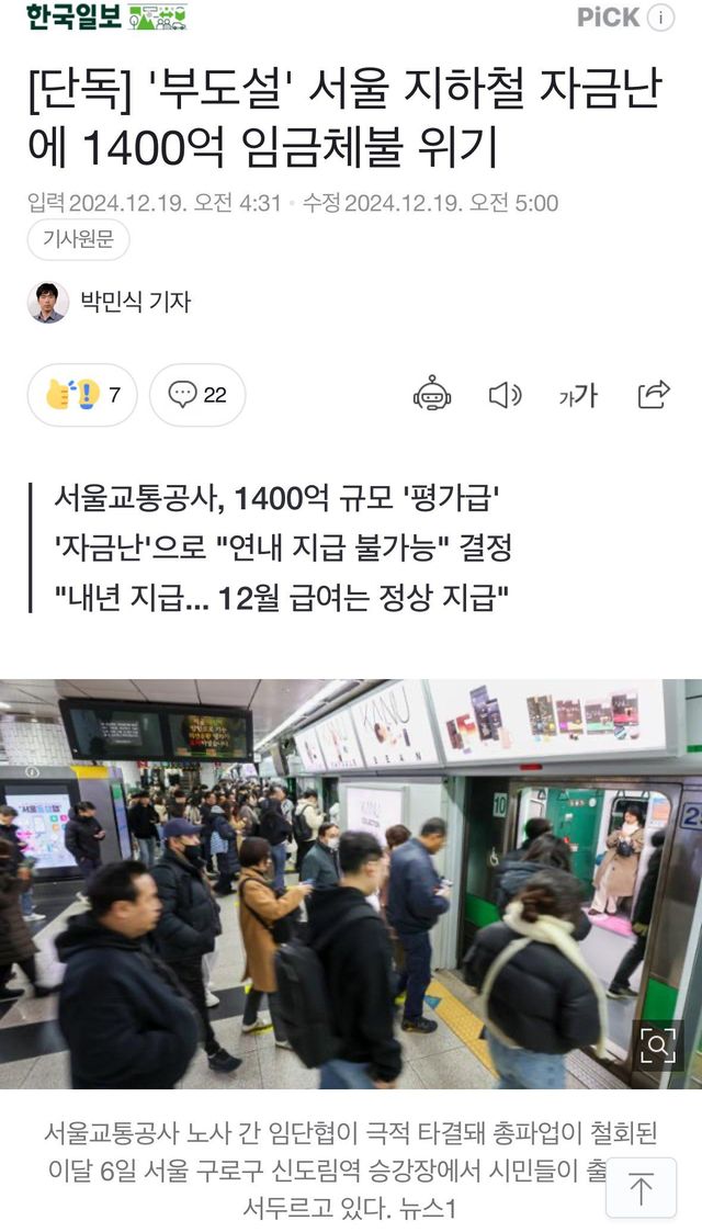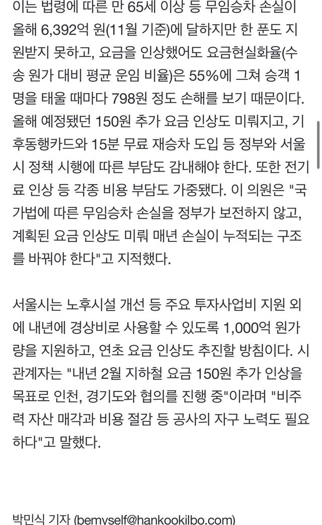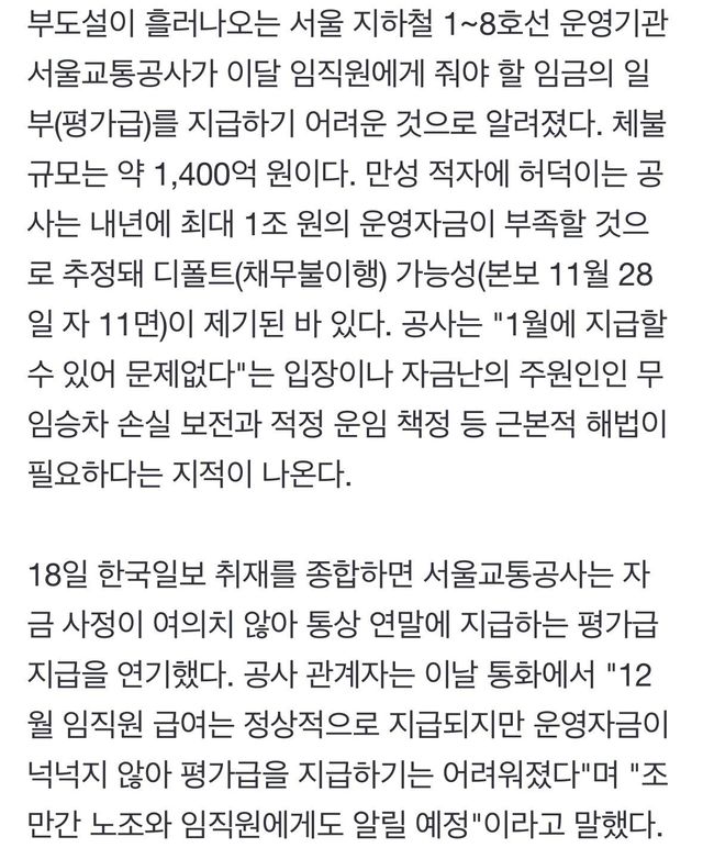 '부도설' 서울 지하철 자금난에 1400억 임금체불 위기