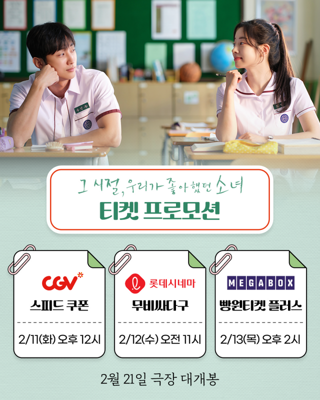11일 배급사 위지윅스튜디오에 따르면 영화 ‘그 시절, 우리가 좋아했던 소녀’는 이날 오후 12시 CGV ‘서프라이즈 쿠폰’을 시작으로 12일 오전 11시 롯데시네마 ‘무비싸다구’, 13일 오후 2시 메가박스 ‘빵원티켓’을 순차 오픈한다.