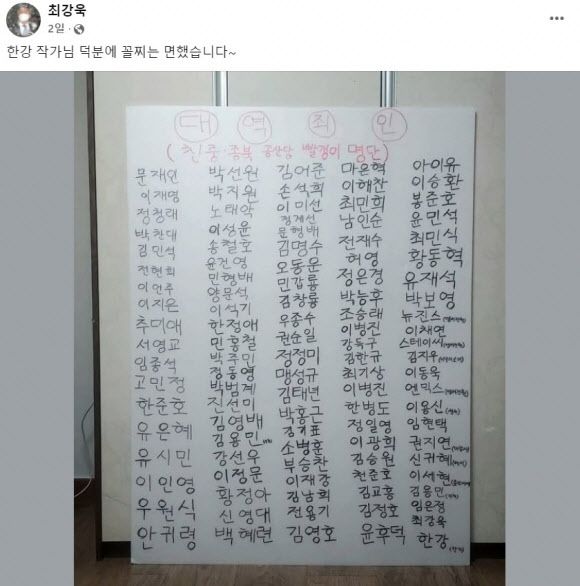 9일 최강욱 전 더불어민주당 의원은 자신의 페이스북에 최근 사회관계망서비스(SNS) 등에 확산한 ‘빨갱이 명단’ 이미지를 공유하면서 “한강 작가님 덕분에 꼴찌는 면했다”고 적었다. 해당 명단에서 최 전 의원의 이름은 명단 우측 맨 아래에 적힌 한강 작가의 바로 위에 위치해 있다.