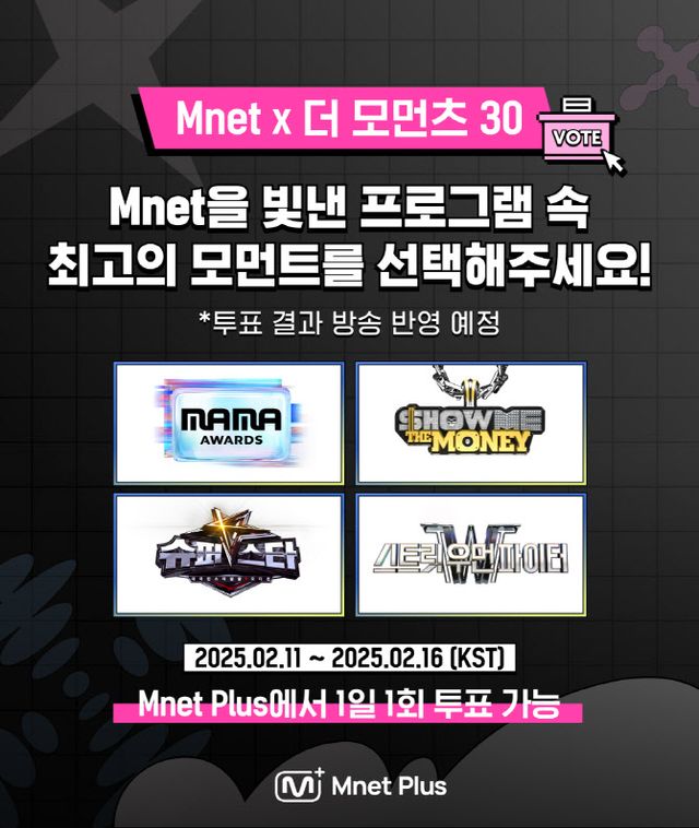 이번 투표는 Mnet의 30년 역사를 빛낸 비저너리(Visionary) 선정작 4개 프로그램의 역대 최고 순간들을 되돌아보는 특별한 자리다. K팝의 위상을 전 세계에 알리며 글로벌 음악 시상식으로 자리매김한 ‘마마 어워즈’(MAMA AWARDS), 대국민 오디션 프로그램의 새 지평을 연 ‘슈퍼스타K’, 국내 최초이자 최장수 힙합 서바이벌 ‘쇼미더머니’, 전에 없던 새로운 포맷으로 K댄스 신드롬을 일으킨 ‘스트릿 우먼 파이터’ 각 프로그램의 주요 모먼트 10개를 선정해 시청자 투표를 진행한다. 시청자가 선정한 최고의 장면 1위부터 10위까지 그 순위가 어떻게 매겨질지 관심이 집중된다.