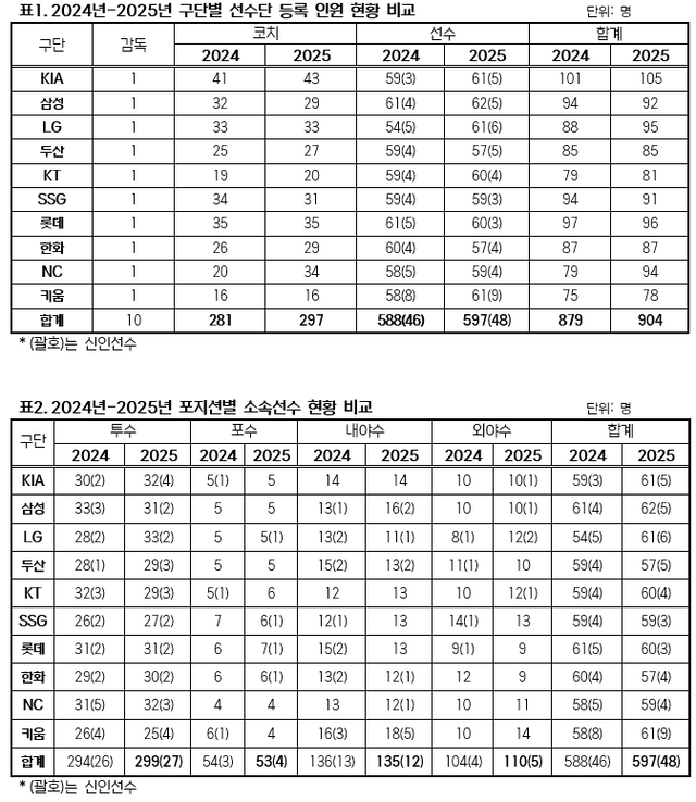 한편 감독을 포함한 코칭스태프 등록 숫자는 지난해 291명보다 16명 증가한 307명이다. KIA는 44명의 코칭스태프를 등록하며 가장 많은 코칭스태프를 등록했다. KBO는 소속 선수의 연봉 집계가 완료되면 추후 연봉 관련 분석 자료를 발표할 예정이다.
