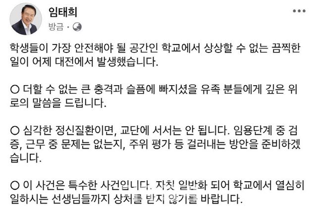 11일 임 교육감은 자신의 사회관계망서비스(SNS)를 통해 “학생들이 가장 안전해야 될 공간인 학교에서 상상할 수 없는 끔찍한 일이 어제 대전에서 발생했다”며 “더할 수 없는 큰 충격과 슬픔에 빠지셨을 유족 분들에게 깊은 위로의 말씀을 드린다”고 밝혔다.