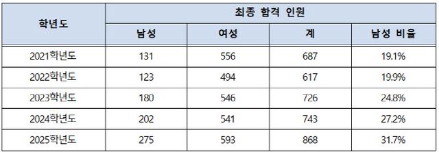 지난 5년간 공립학교 중등학교 교사 합격자 중 남성이 차지하는 비율은 2021학년도 19.1%에서 매년 꾸준히 상승했다. 2022학년도 19.9%, 2023학년도 24.8%, 2024학년도 27.2%를 기록했으며, 올해인 2025학년도에는 처음으로 30%를 넘어섰다. 이는 2021학년도와 비교해 12.6%포인트 증가한 수치다.