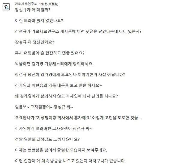 또한 김세의 가세연 대표는 채널 커뮤니티를 통해 "장성규가 왜 이러는 걸까? 이런 드라마 있지 않나?"라며 글을 올렸다. 그는 "장성규가 가세연 게시물에 댓글을 남겼다는데 어디 있는지 보이지 않는다. 장성규 제정신인가? 혹시 어젯밤 술 한잔하고 댓글 쓴 건가?"라며 반문했다.